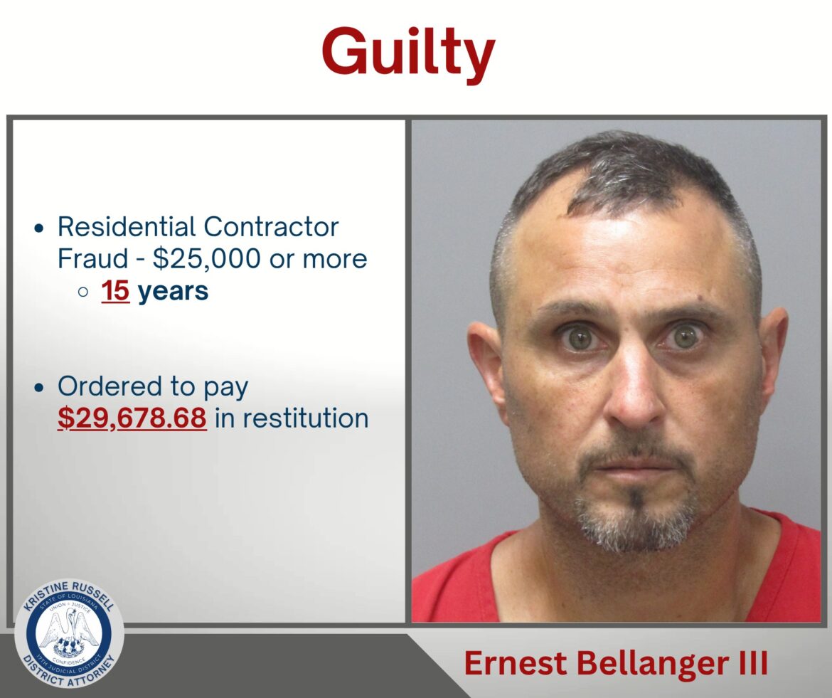 According to the Lafourche Parish District Attorney’s Office, Ernest Bellanger III, 43, pled guilty to Residential Contractor Fraud – $25,000 or more.