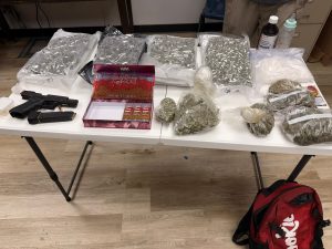Authorities say a search of the vehicle uncovered approximately 5.6 pounds of marijuana, 1.4 pounds of methamphetamine, 56 grams of synthetic marijuana, 25 MDMA pills, 6 grams of crack cocaine, THC vape products, promethazine, and a loaded firearm.