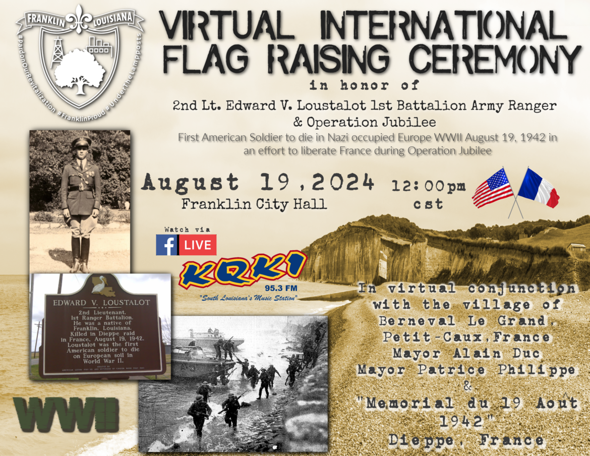 FRANKLIN, La.—On Monday, August 19, 2024 at Noonat City Hall the City of Franklin will be conducting a LIVE Virtual Wreath Laying/Flag Raising Ceremony in honor of Army Ranger, 2nd Lt. Edward V. Loustalot whom was the 1stAmerican Solider to die in Nazi occupied Europe during World War II on August 19, 1942. KQKI 95.3 FM will be collaborating with the City of Franklin and Petite Caux, France to dual live stream this ceremony. The French government and its citizens have commemorated and memorialized Lt. Loustalot annually since August 19, 1946.