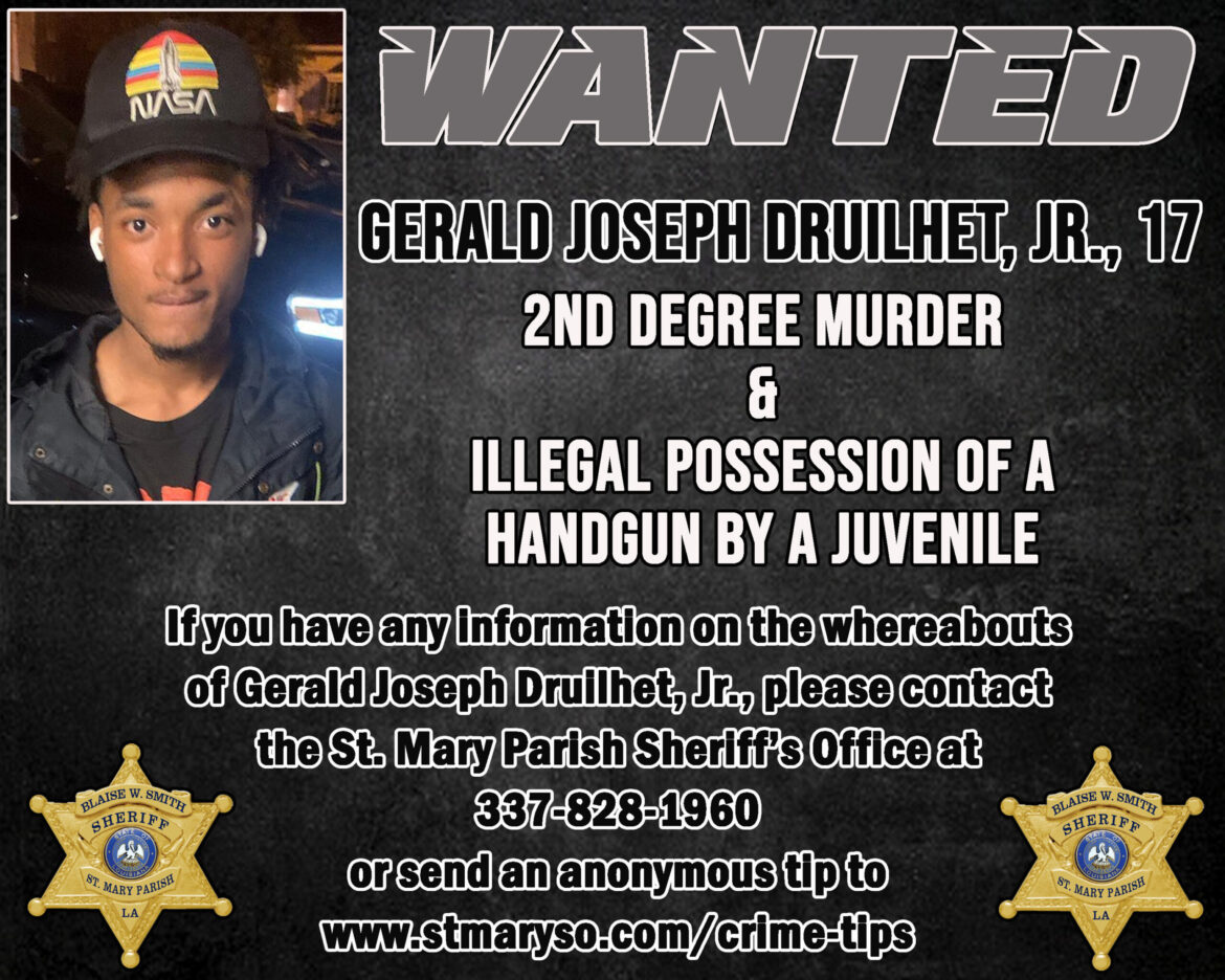Detectives identified the subject in the shooting as Gerald Joseph Druilhet, Jr., 17, of Baldwin. A warrant was obtained for the arrest of Gerald Druilhet, Jr. on the charges of 2nd-degree murder and illegal possession of a handgun by a juvenile.