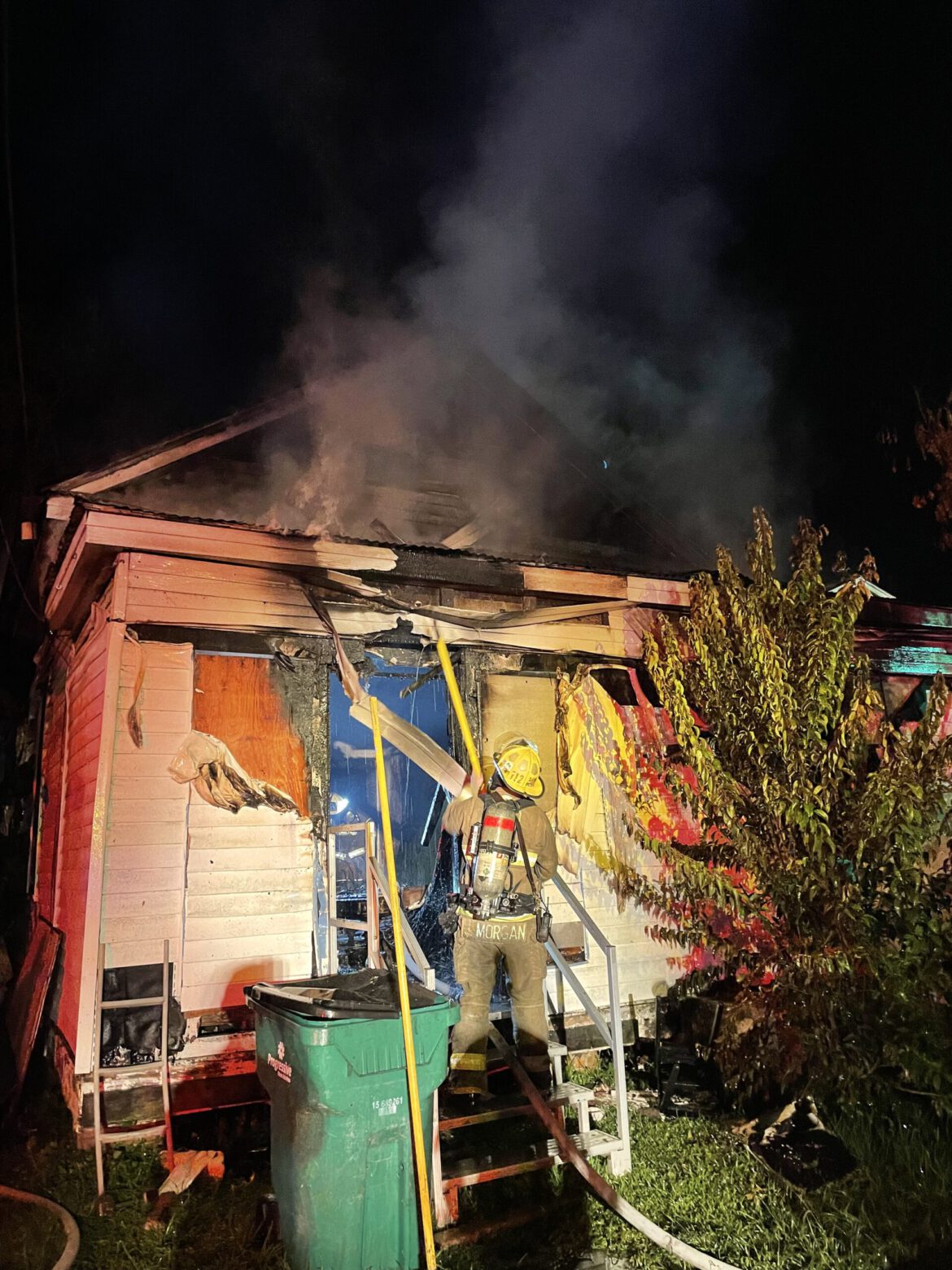 The house sustained heavy fire, smoke and water damage throughout the structure. It was being occupied, although it was not an official residence, due to it being under renovations. A neighbor’s two story garage-apartment received fire damage to the apartment, attic, and front room from direct fire contact and radiant heat. Fire damage was contained to those areas on the exposure structure.