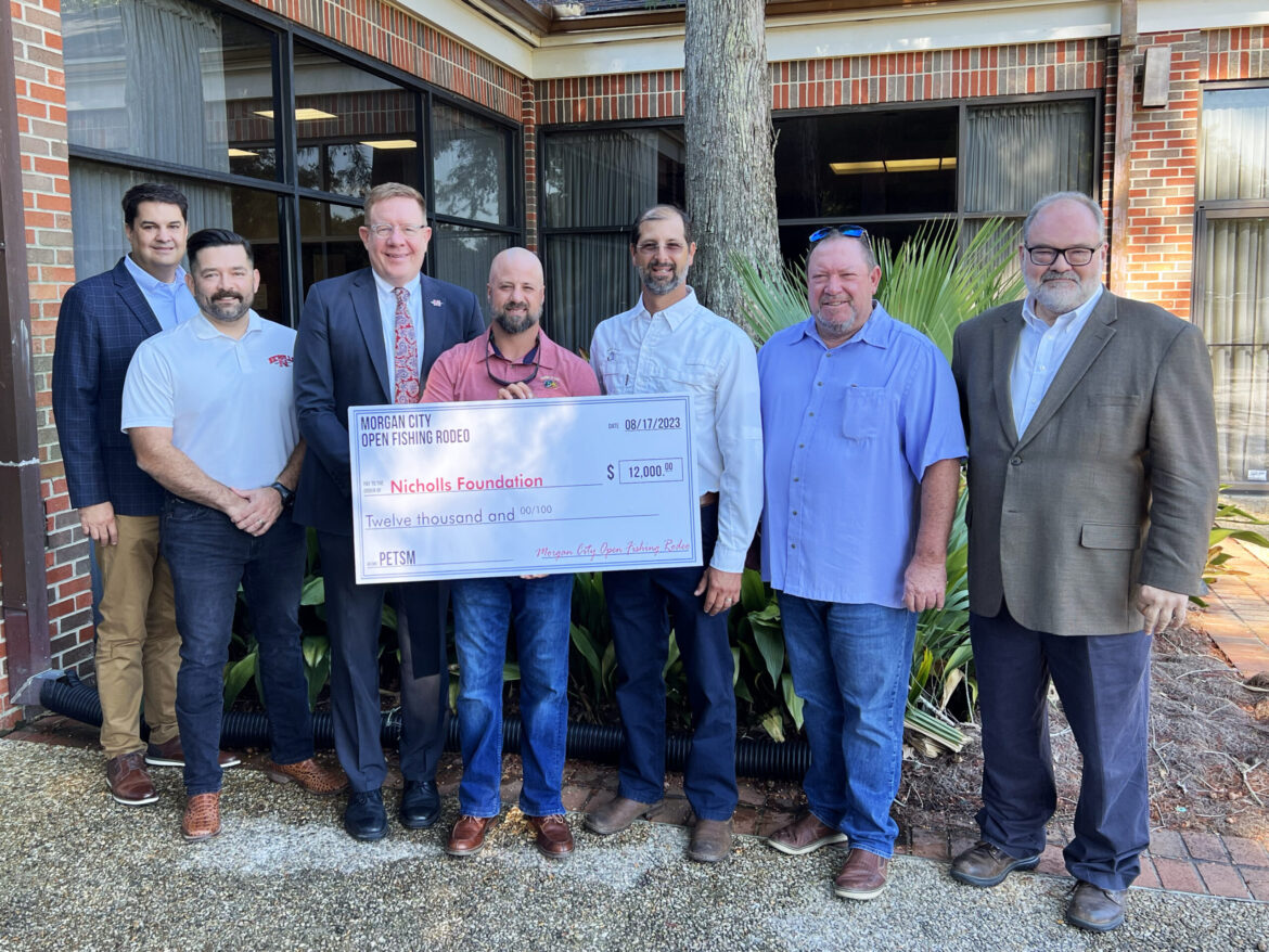 THIBODAUX, La. – Nicholls State University’s Department of Petroleum Engineering Technology and Safety Management (PETSM) recently received a $9,500 donation from the Morgan City Open Fishing Rodeo (MCOFR), while Nicholls Veterans Services received a $2,500 donation. This marks MCOFR’s 11th year contributing to Nicholls’ PETSM program and the third year supporting the university’s veterans.