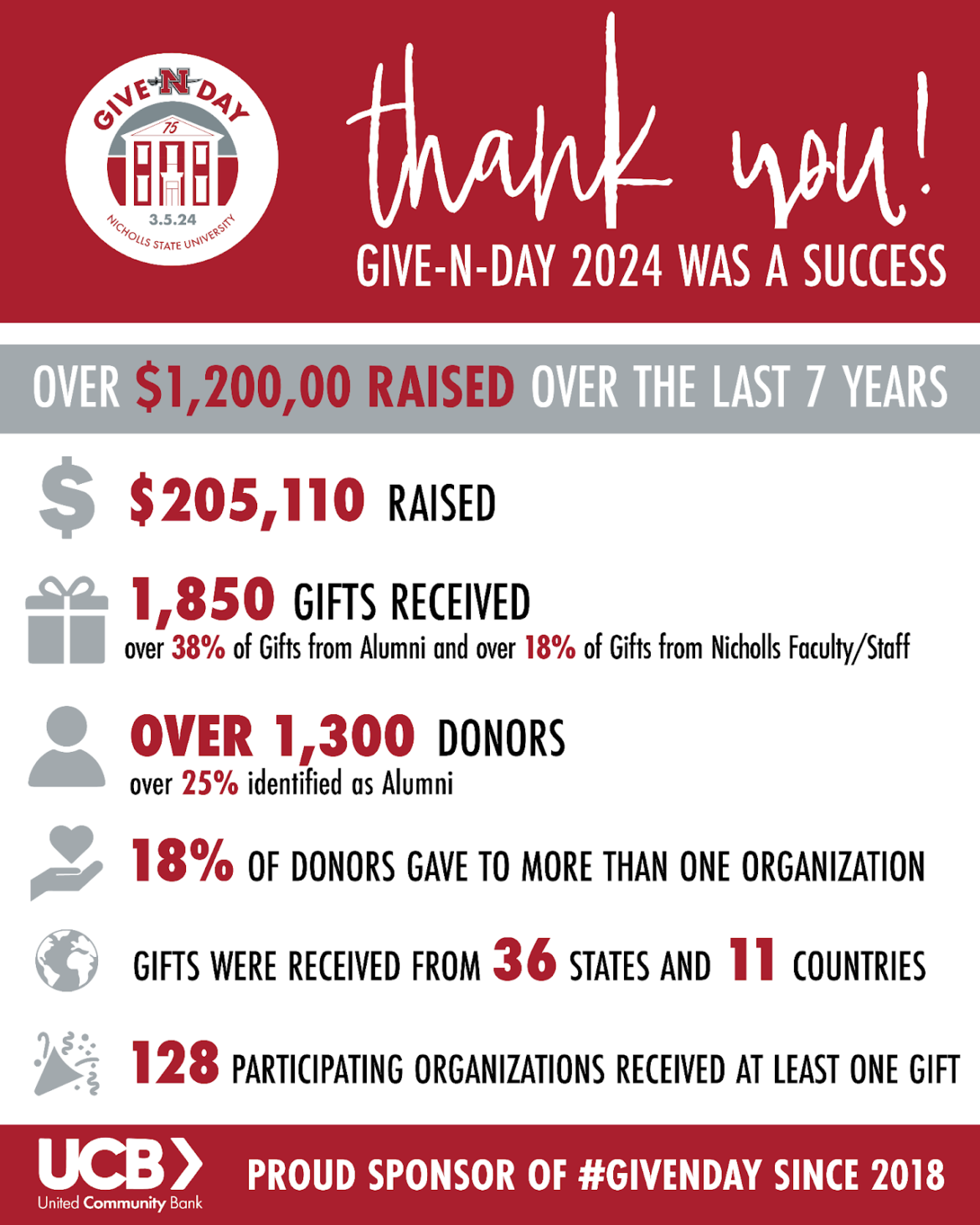 After its seventh Give-N-Day, The Nicholls Foundation has raised over $1.2 million for the University’s departments and student organizations. Nicholls’ 2024 Give-N-Day raised over $205,000 with over 1,300 donors and 1,850 donations.