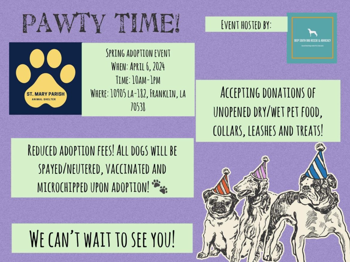 The Deep South Dog Rescue & Advocacy Group in alliance with St. Mary Parish Animal Shelter will be holding a special adoption event on Saturday, April 6th. Their dedicated team is thrilled to be holding this event in hopes to helping you find the perfect pet that will fill your heart with joy and endless tail wags.