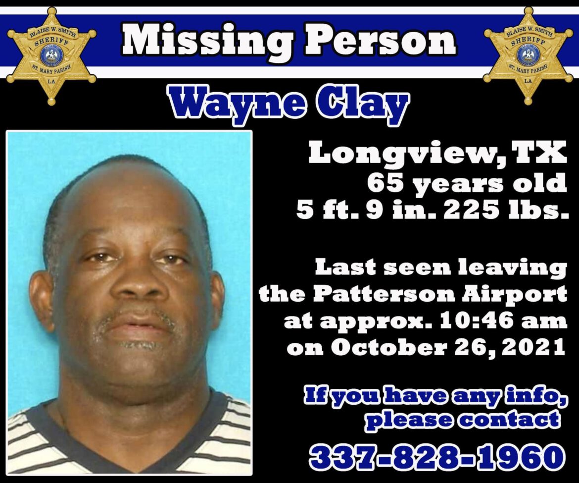 Mr. Wayne Clay of Longview, Texas, was last seen leaving the Patterson Airport on October 26, 2021, at approximately 10:46 am.