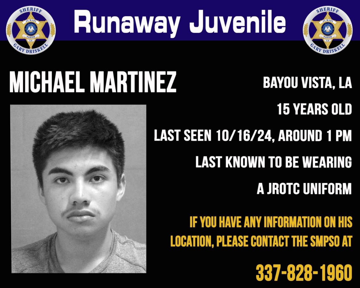 ๐ ๐ถ๐ฐ๐ต๐ฎ๐ฒ๐น ๐ ๐ฎ๐ฟ๐๐ถ๐ป๐ฒ๐, ๐ญ๐ฑ, ๐๐ฎ๐๐ผ๐ ๐ฉ๐ถ๐๐๐ฎ, was last seen at 1230-1300 on Beau Lane in Bayou Vista. He was reported missing Wednesday at 4:01 pm and was last known to be wearing his JROTC uniform. If you have any information on his location, please contact the SMPSO dispatch at 337-828-1960.