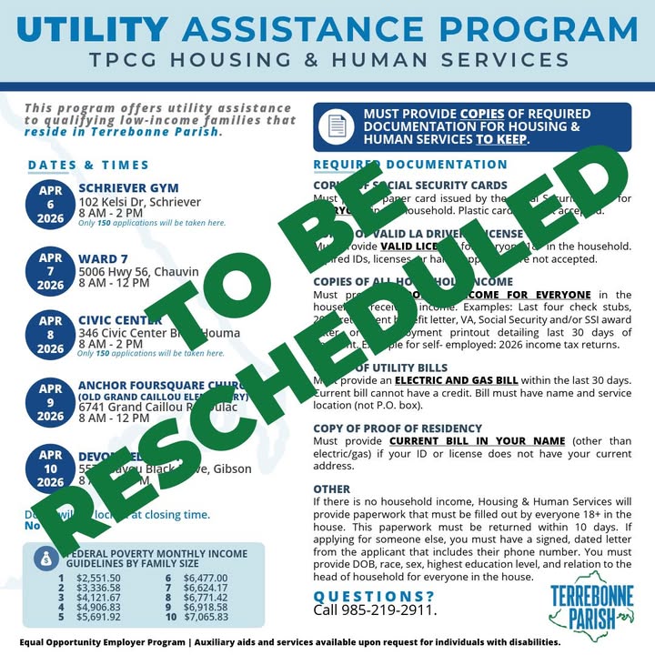 The Terrebonne Parish Consolidated Government (TPCG) Department of Housing and Human Services has announced that the utility assistance outreach originally scheduled for April 2026 is being rescheduled. The department will provide additional details, including the new dates for the outreach, as soon as they are confirmed.