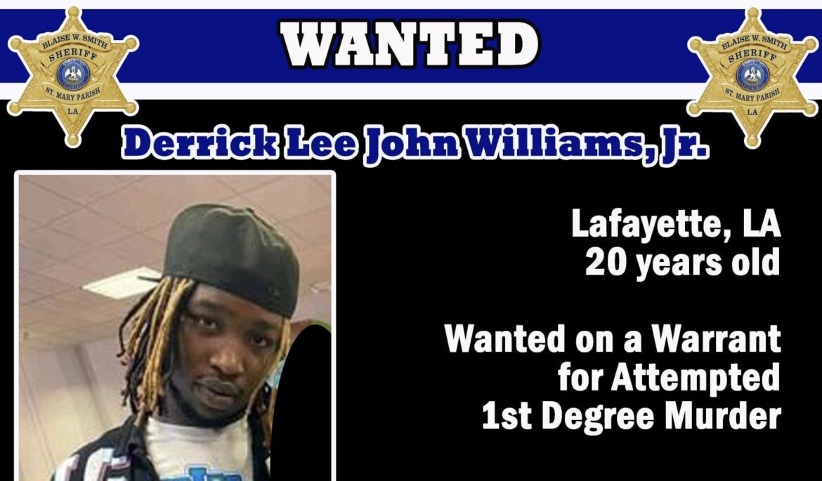 Detectives are asking that the public submit any information on the whereabouts of Derrick Lee John Williams, Jr. to the St. Mary Parish Sheriff’s Office by calling 337-828-1960. Tips can also be submitted anonymously on the website at www.stmaryso.com.